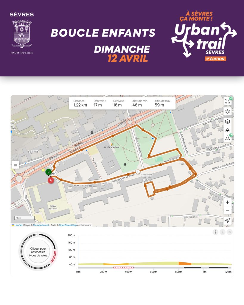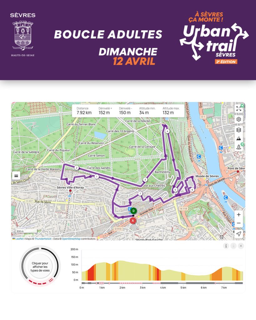 Sèvres, ses coteaux, ses rues en pente, ses escaliers… les amateurs de dénivelé seront servis avec un itinéraire original, ponctué de points d’animation et un dénivelé positif d’environ 179 m.