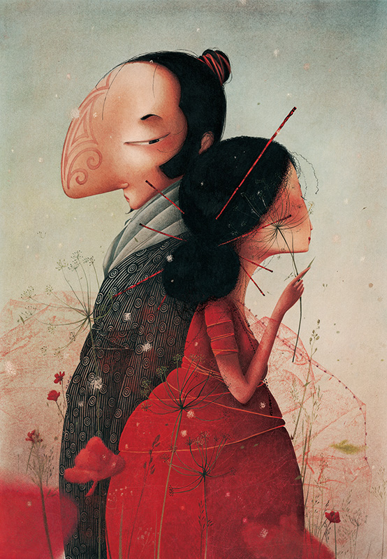 Sous son pinceau, Cyrano devient un samouraï élégant au profil affirmé, tandis que Roxane apparaît comme une figure lumineuse et délicate. Les illustrations, d’une grande richesse graphique, jouent sur les textures, les contrastes et les couleurs pour traduire la poésie et l’ironie du texte original.