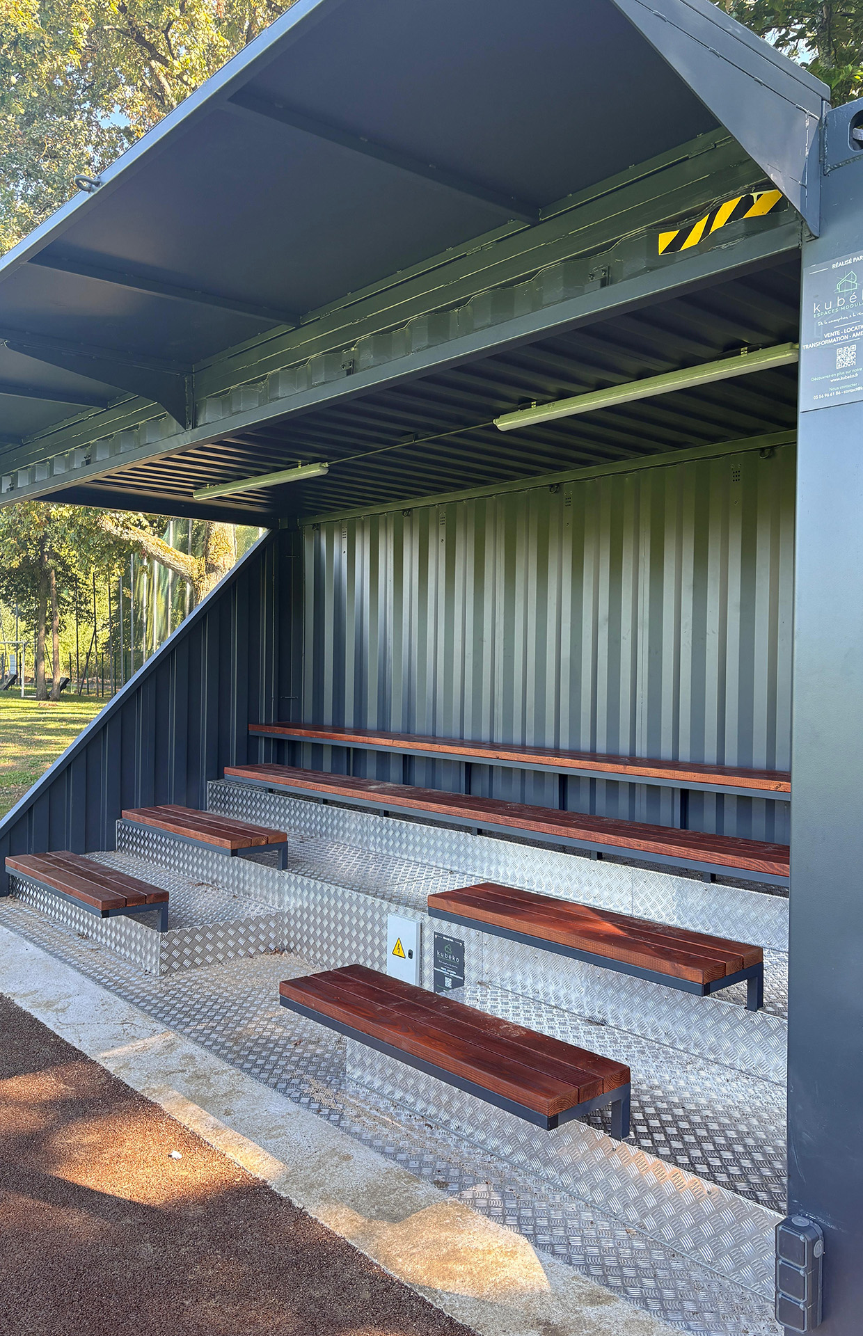 Les abords du terrain ont été entièrement traités : remplacement des mains courantes et pare-ballons, aménagement d’un chemin périphérique en enrobé drainant côté forêt pour un accès confortable, même par temps de pluie. Les spectateurs bénéficient désormais d’une tribune, pouvant accueillir 30 personnes dont 2 places sont réservées aux personnes à mobilité réduite, située dans l’axe du terrain pour une visibilité maximale.