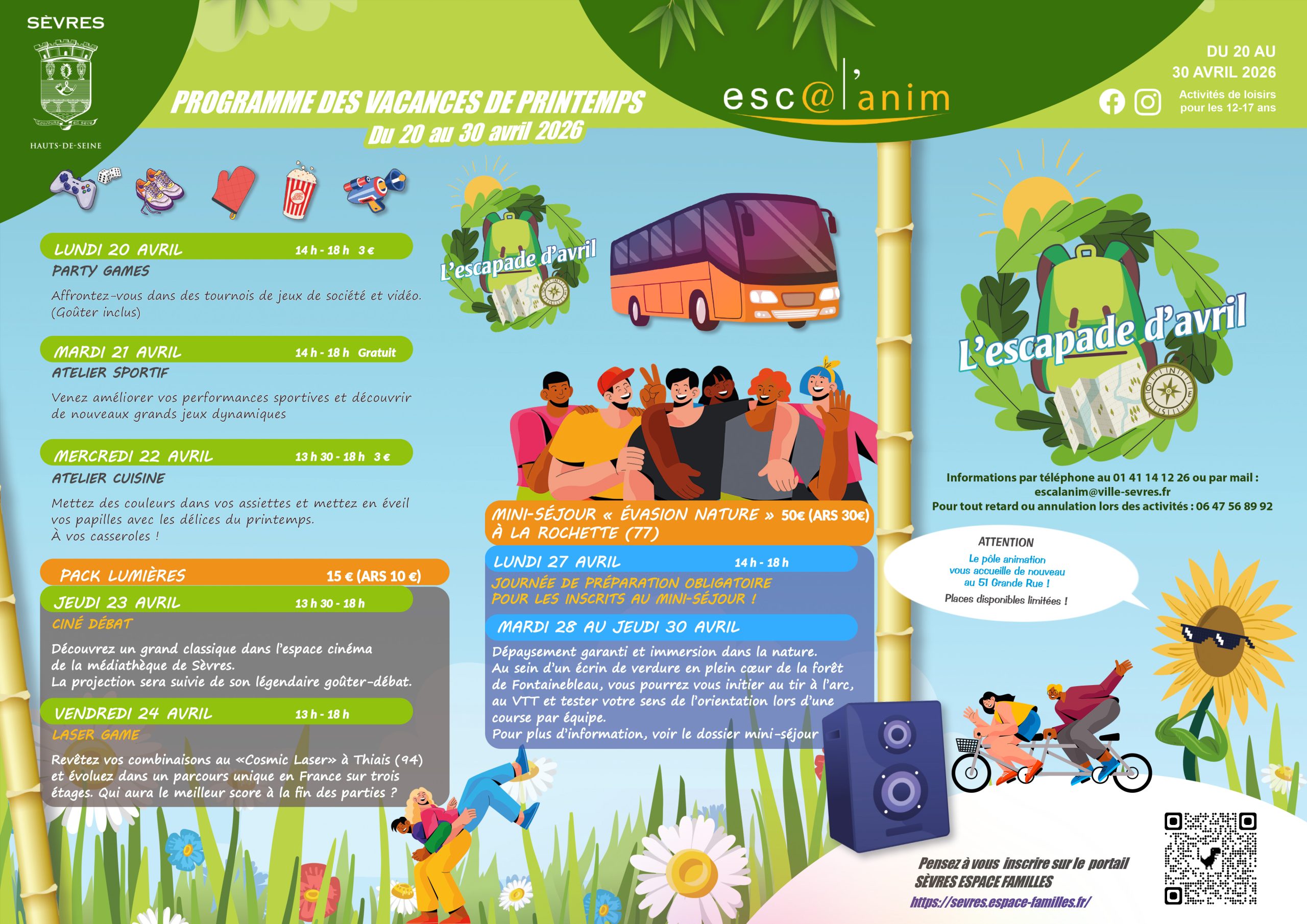 L’inscription aux activités est conditionnée à l’inscription via le portail Sèvres Espace Familles avec les documents obligatoires à fournir , sous réserve du nombre de places disponibles. Les non Sévriens peuvent s’inscrire mais ne sont pas prioritaires.