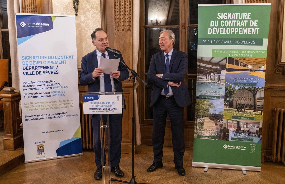 Depuis plus de dix ans, le Département des Hauts-de-Seine accompagne Sèvres par des contrats de développement pluriannuels. Le cinquième, signé le 27 novembre 2025, mobilise 8,63 M€ pour 2025-2027 : 7 M€ d’investissement, 1,63 M€ de fonctionnement.